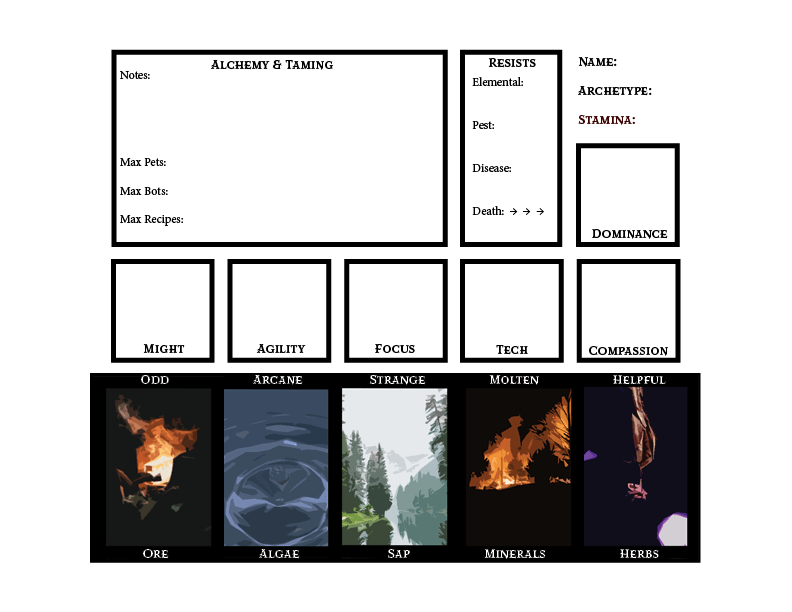 It’s a character sheet that doubles as a play mat for tracking resources. The bottom of the character sheet has graphics representing each of the Alchemy Resource Currencies in the game. Using poker chips, coins or anything similar you can track how many you have of each resource by building a stack in the corresponding resource area.