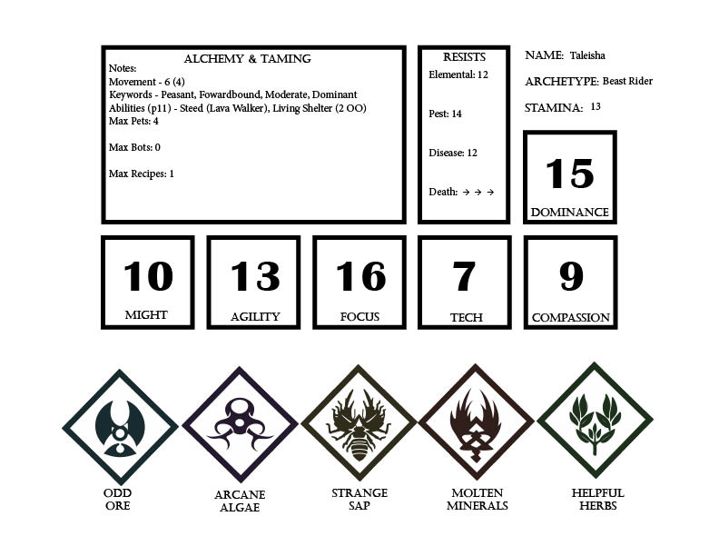 Each Pre-Gen has all necessary stats, keywords and archetype abilities you need to play! Furthermore the character sheet notes the page in the rulebook where you can read more about your Archetype